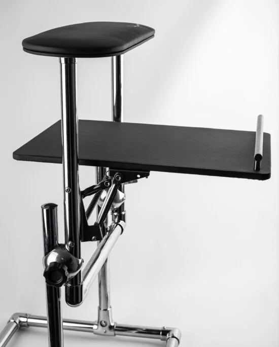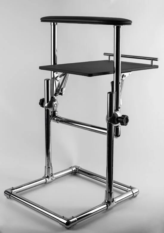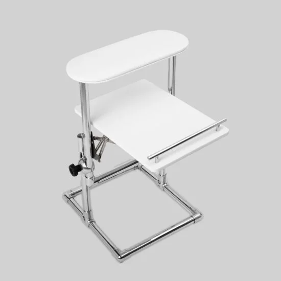 Pedikir stalak izrađen od jake metalne hromirane baze, sa jastukom za stopala i sklapajućom policom za lampu ili drugi materijal.